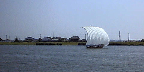 風の力で網を引く。このとき船本体は
